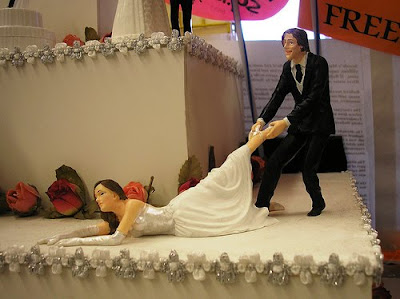 I've come to the conclusion that people cake toppers are more or less out. There's a couple of fun ones out there, but its tough to be irreverently humorous in a way that all the guests will find amusing (read: old folks), and my taste for irreverent humor tends to lead in to the offensive type of content.