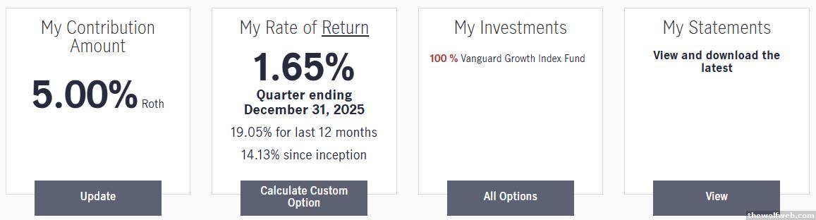 ^^I guess I'm a little confused about what you're trying to show?The first time you posted returns, I thought maybe it was a humble brag about 12-month and since inception returns since those were still pretty good.Quarterly returns is kind of an odd way to look at long-term investments.And is "since inception" meaning the inception of your account, or the inception of your chosen investment fund? And is that an average annual return since inception, or a total return? I know for sure that's not a total return on Vanguard Growth since the fund's inception.I'm not in any way defending the Trump economy. But I've got no better option than long-term investment in U.S. stocks. Apparently even when we have a lunatic at the helm. . .Growth stocks have been on a tear for a long time, but sometimes value stocks rotate into the lead. You might be picking a style preference without realizing it.If this is the first negative you have ever seen, you're doing great. You should expect more quarterly negatives, and even negative years in your investing lifetime.]