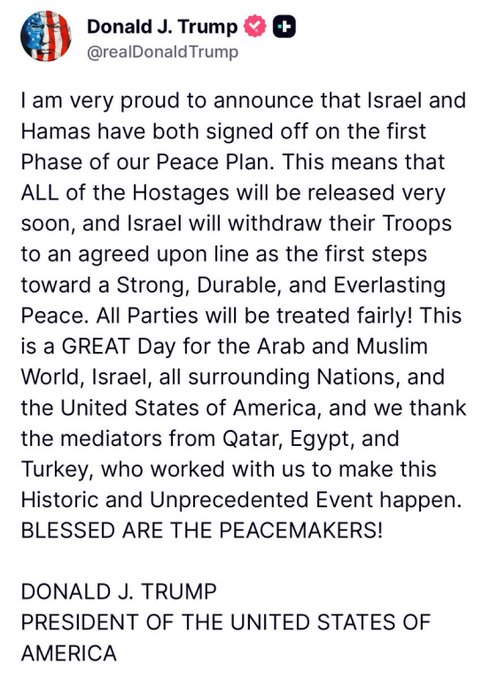 [Edited on October 8, 2025 at 8:15 PM. Reason : prob not though. as long as the hostages come home and hamas surrenders so the war can end]