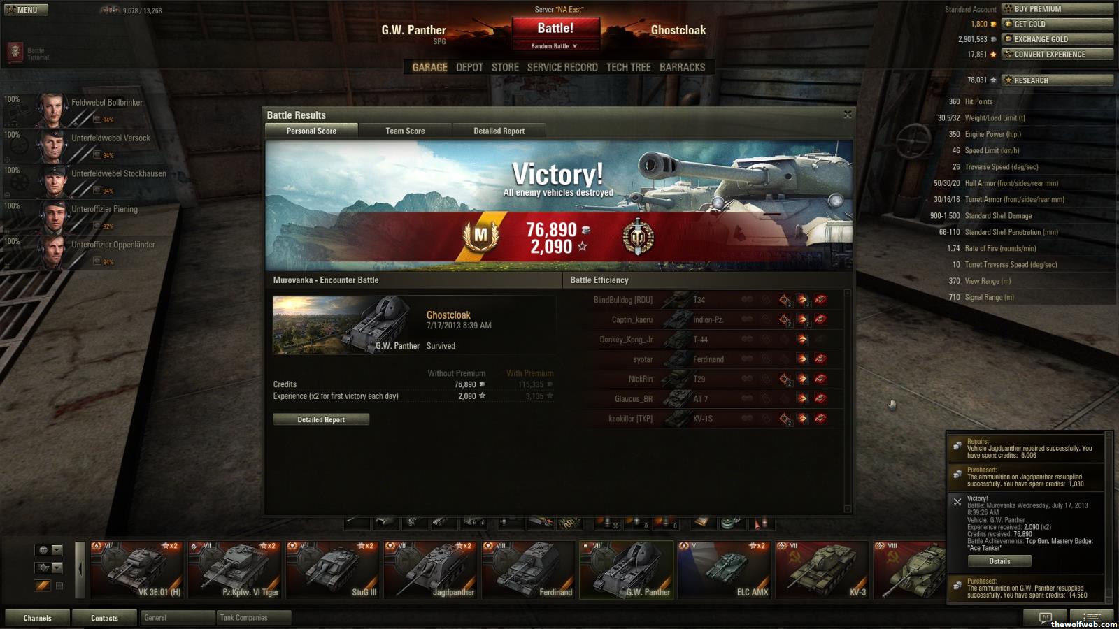 Tank Tier TypeLTP III LTKV-3 VII HTKV-4 VIII HTIS-3 VIII HTIS-8 IX HT.T7 Combat Car II LTM4 Sherman V MTM4A3E8 Sherman VI MT T18 II TD.AMX 13-75 VII LTAMX 13 F3 AM VI SPG.Pz.Kpfw. 35 (t) II LTVK 28.01 VI LTAufklärungspanzer Panther VII LTVK 36.01 (H) VI HTPz.Kpfw. VI Tiger VII HTStuG III V TDFerdinand (no crew) VIII TDJagdTiger IX TDG.W.Panther VII SPG